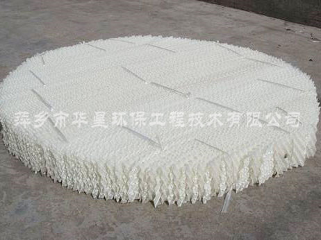 塑料規(guī)整填料具有重量輕,通量大、壓降低、比表面積高、易更換等優(yōu)點。絲網(wǎng)波紋填料由聚丙烯與聚丙烯腈線混合編織網(wǎng)組成。波紋填料可采用聚丙烯PVDF板,為提高傳質(zhì)效率,板上可開孔。塑料規(guī)整填料有:板波紋填料、孔板波紋填料、絲網(wǎng)波紋填料和斜波紋填料等。
